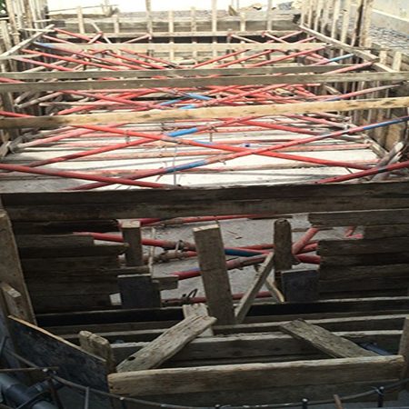 وبعد اعمال الحفر وصب الخرسانه العادية وانشاء الطوب الاسمنتى والعزل بلفائف الانثومات تقوم الشركه باعمال التخشيب والنجاره وعمل الشدادات المناسبه للحفاظ على الحوائط  الجانبيه لحمام السباحة وذلك للتحضير لصب الخرسانة المسلحة.